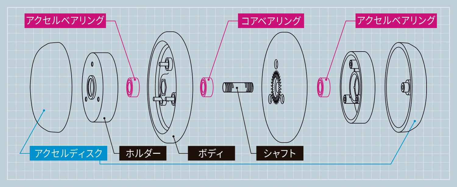 本体を手に持った状態でストリングを勢いよく引くことで、本体を投げずに高速回転させることができる日米で特許出願済の新機能「アクセルシステム」を搭載したハイパーヨーヨーシリーズです。本機能を搭載したことにより、従来のヨーヨーでは再現不可能な新たなトリックが可能となりました。